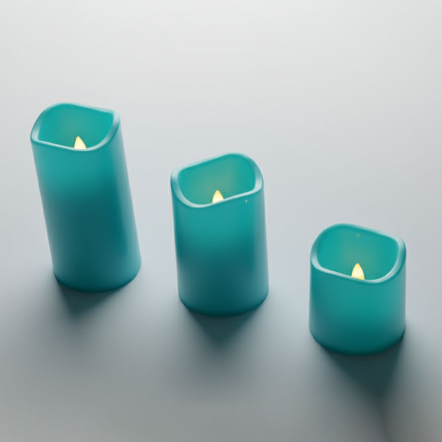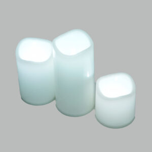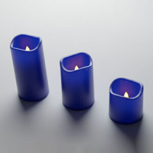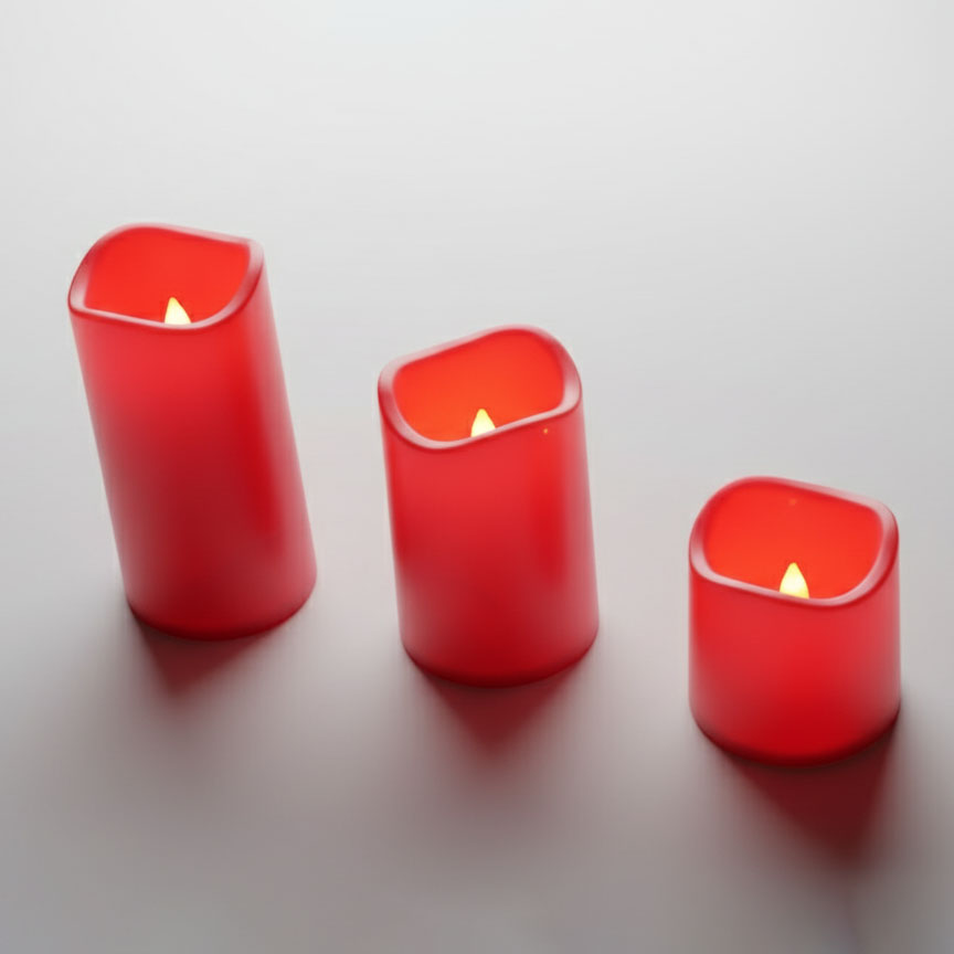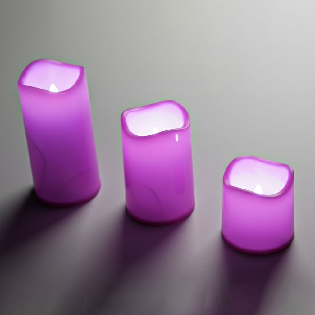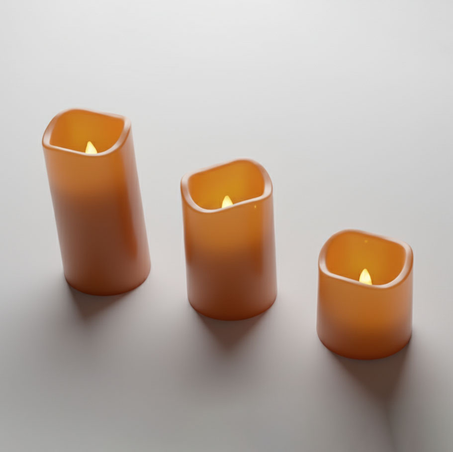 ensemble de trois bougies LED décoratives de tailles différentes, dans un arrangement descendant.