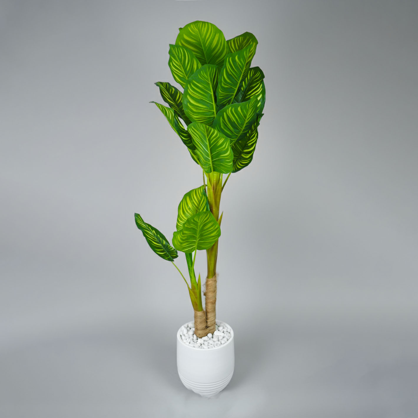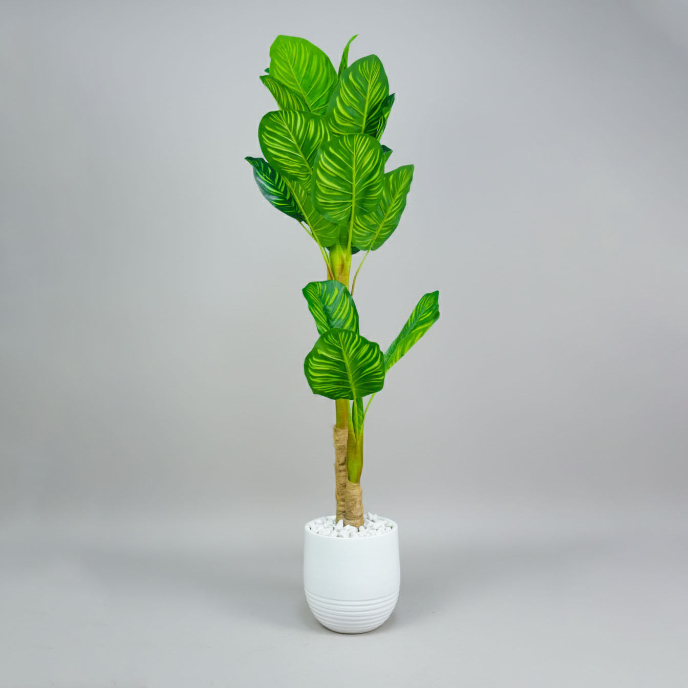 Plante verte artificielle au feuillage luxuriant, présentée dans un pot blanc moderne.