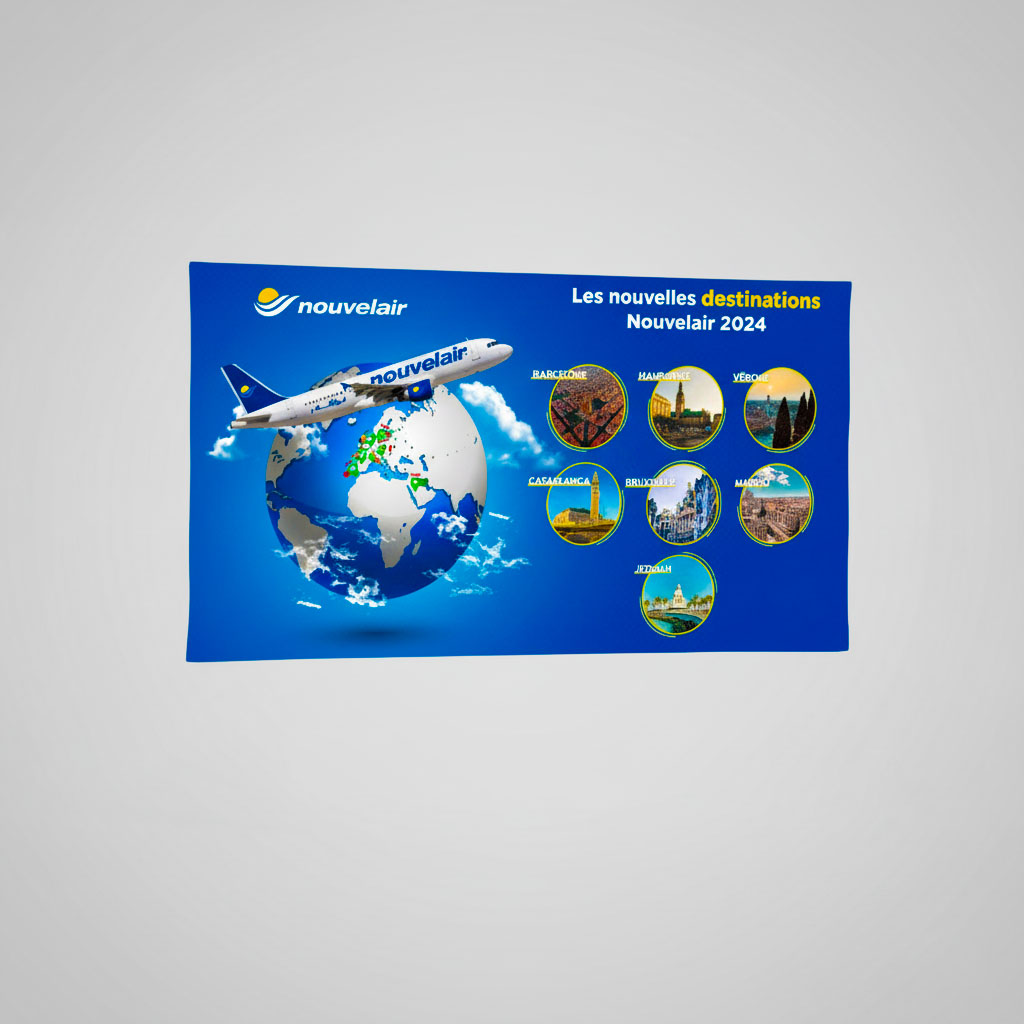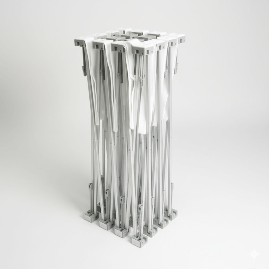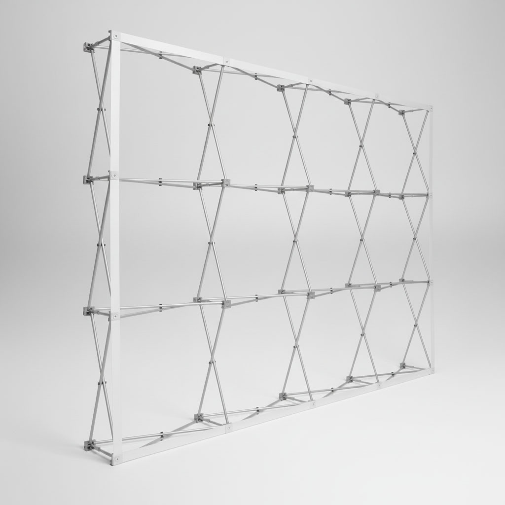 Stand parapluie textile droit L3m x H2m25 (4×3) + visuel textile blackout. Structure légère, facile à monter et à transporter.